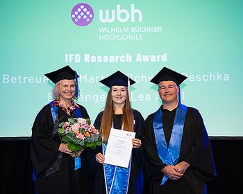Der IFG Research Award, verliehen vom An-Institut für Forschung und Gestaltung, ging an Lea Apfel, Masterabsolventin im Studiengang „Innovations- und Technologiemanagement“. Martina Schwarz-Geschka, Expertin der WBH für Innovation, Strategieentwicklung und Zukunftsforschung, übernahm die Laudatio und überreichte den Preis persönlich.