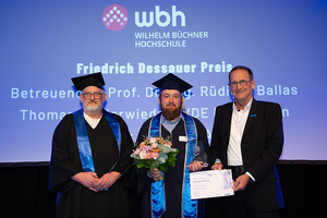 Auch in diesem Jahr konnte sich die WBH über einen Preisträger des Friedrich-Dessauer-Preises freuen: Benedikt Althaus, Bachelor-Absolvent im Studiengang „Elektro- und Informationstechnik“, überzeugte mit seiner Abschlussarbeit zum Thema „Entwicklung eines Konzepts zur automatisierten Systemprüfung von elektromechanischen Türbeschlägen“. Der VDE Rhein-Main würdigt mit dem Preis hervorragende Leistungen auf technisch-wissenschaftlichem Gebiet und betont zugleich die gesellschaftliche Bedeutung von Ingenieur:innen und ihrer Arbeit. Die Laudatio hielt Prof. Dr.-Ing. Rüdiger Ballas.