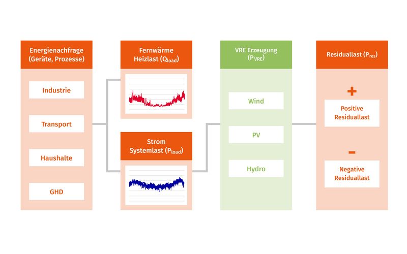 Im Kern dienen die Forschungsaktivitäten der quantitativen Entscheidungsunterstützung für Stakeholder aus Industrie und Politik. Die Analysen zeichnen sich im Besonderen dadurch aus, dass alternative Lösungsansätze sozio-techno-ökonomisch bewertet werden. In der Regel kommt dabei die Szenario-Technik zum Einsatz, um Handlungsräume zu skizzieren und darauf aufbauend Handlungsempfehlungen abzuleiten. Arbeiten in jüngerer Vergangenheit beschäftigten sich im Wesentlichen mit der Einbindung von Sektorkopplungsoptionen in das Energiesystem. In Abb. 3 ist ein exemplarischer Ausschnitt aus dem Modell-Schema dargestellt. Daraus wird ersichtlich, dass die integrierte und zeitlich aufgelöste Betrachtung der Nachfrage- und Erzeugungskapazitäten ein wesentliches Element des Modellierungsansatzes darstellt. Neben eigenentwickelten Modellen werden auch Open-Access-Modelle (OSM) eingesetzt, die in der Energiesystemanalyse zunehmend Verbreitung finden.