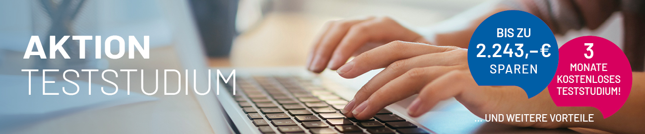 Entscheiden Sie sich im Rahmen unserer Teststudium-Aktion für Ihr Fernstudium und profitieren Sie von einer Reihe von Vorteilen. Bis zum 14. März 2026 profitieren Sie von bis zu 1.444 € Rabatt und weiteren attraktiven Vorteilen für Ihren Studienstart.